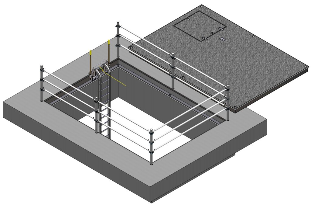 점검구 개방시에는 장비 반입구 외각에 안전 펜스를 설치후 휴대용 개방장치를 장치하여 점검구를 개방하고 개구부 내부에 개구부 안전 펜스를 설치 추락 사고를 방지 할 수 있음.