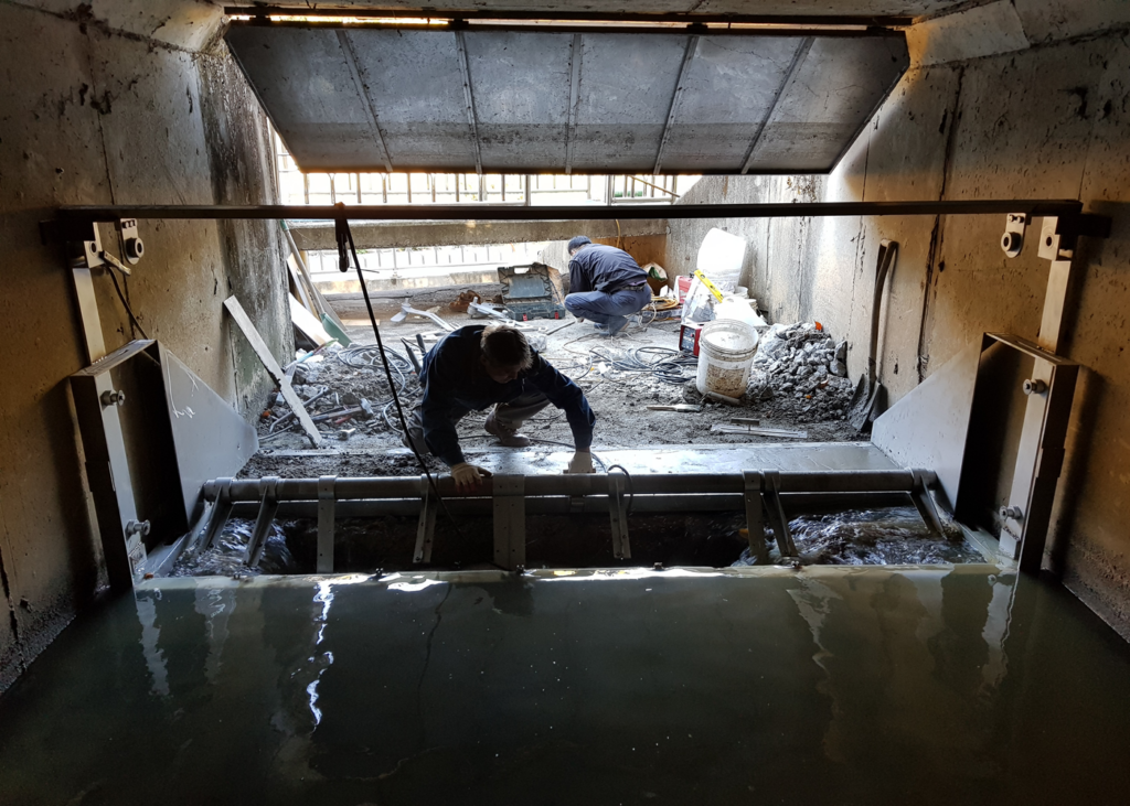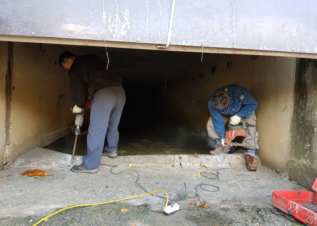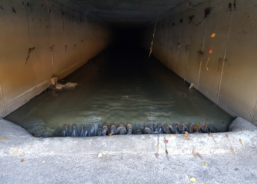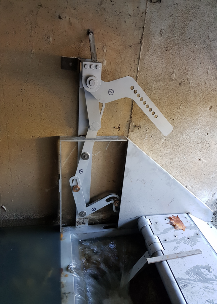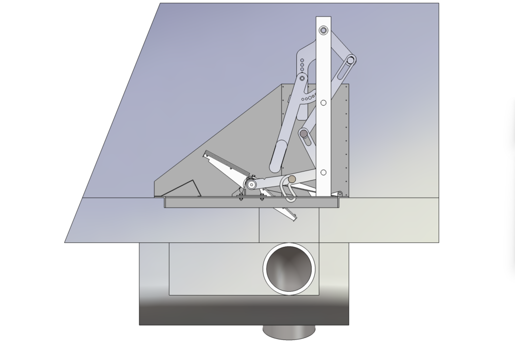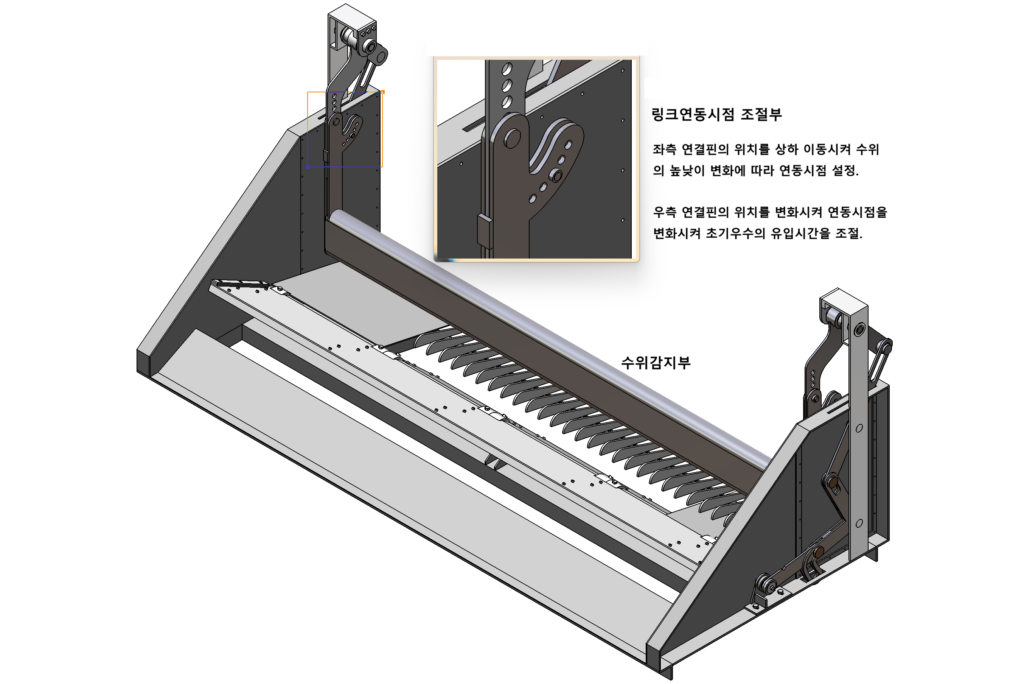 후방 수위감지부 회전에 링크연동 하단 회전판이 회전 되면서 우수 유입량을 조절하고 토사 및 고형물은 외부로 유도하는 과정